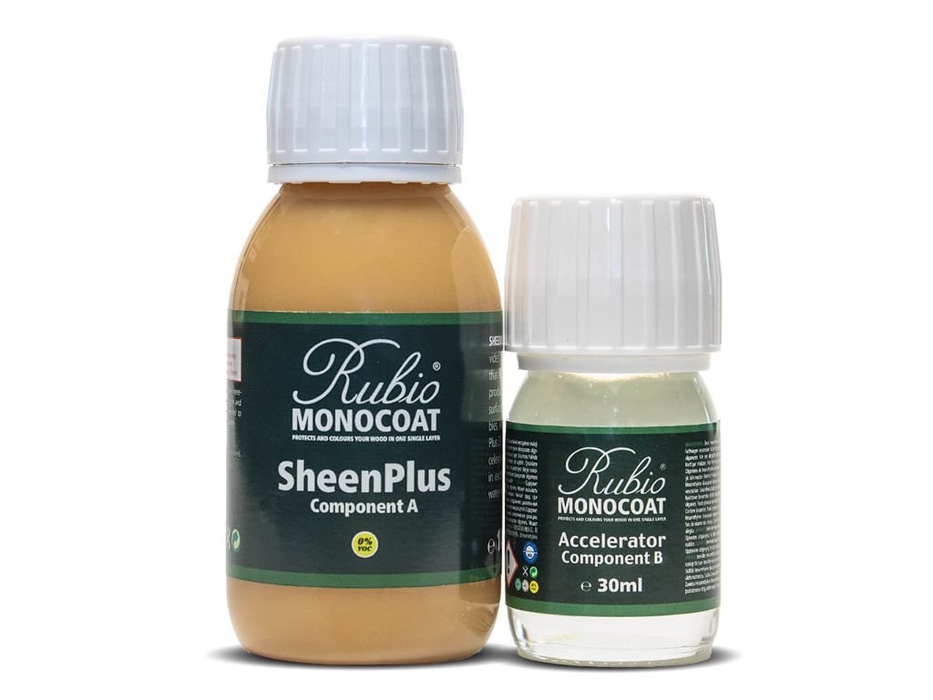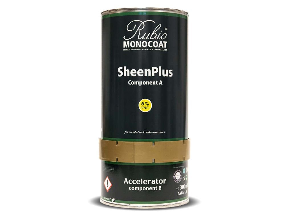 Rubio Monocoat SheenPlus je špeciálna povrchová úprava pre drevené povrchy pre zvýraznenie lesku, ktorá dodáva naolejovaným dreveným povrchom odolný saténový vzhľad. Tento produkt je ideálny pre aplikáciu na rôzne druhy dreva v interiéry, ako je nábytok, pracovné dosky, stoly, schody, steny a podlahy, ktoré boli už ošetrené olejom Oil Plus 2C. Kombinácia oleja (A) a urychlovača (B) vytvára rýchle tuhnutie povrchu, čo zaisťuje vynikajúcu ochranu dreva. Naviac sa jedná o produkt bez rozpúšťadiel a vody s nulovým obsahom škodlivých látok VOC.