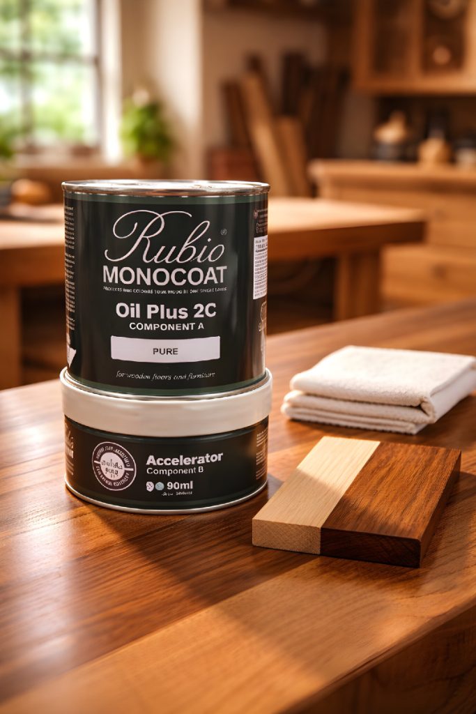 Bezfarebný prírodný olej na drevo s akcelerátorom so zvýšenou odolnosťou voči oteru a vode. Rubio® Monocoat Oil Plus 2C je